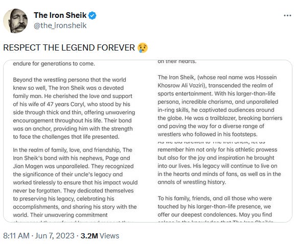 Even those of us who have not been invested in pro wrestling for a good long time are sad about the passing of the Iron Sheik: