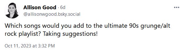 I know I am continuing to proselytize about BlueSky—in a way that even surprises me—but I am primarily there now and would encourage you to join me if you use any of the microblogging platforms. I have even noticed that there’s a little more fun in the space now, whether you’re looking for the best Alt 90s tracks: